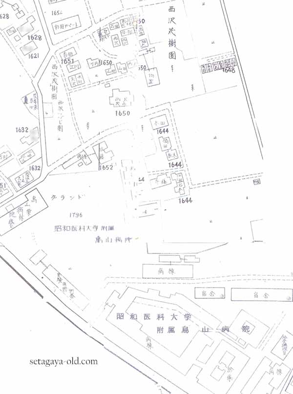 大正15年に開業した昭和医科大学付属烏山病院。現在はグランドがあった北部に移動し、元場所にはエルザ世田谷という超高層マンションが2006年に建った。現:16番地にある西沢つつじ園は、元々は茂樹園で戦後になって畑にもツツジを植えたのがつつじ園の始まりという。当時は現:15番地に西沢つつじ園が少しある程度だったのかもしれない。毎年4月から5月にかけてツツジの花が見事に咲き乱れ、代々受け継がれてきた土地で、「つつじ博士」の異名を持つ西沢さんがおよそ100種類のツツジを育てている。その美しさは圧巻だ。挿し木から苗を作り、苗は購入することも可能。