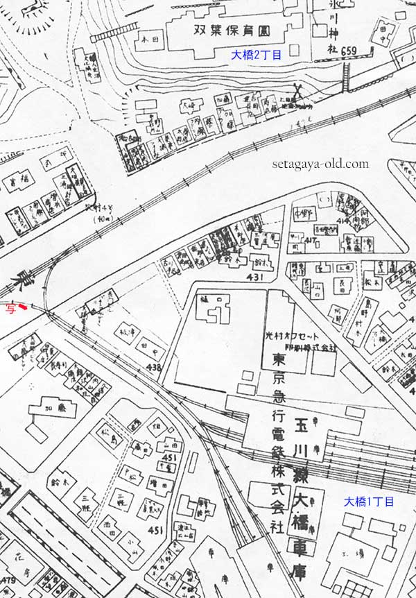 世田谷区の池尻に接する目黒区大橋周辺。当時の町名は上目黒7~8丁目で昭和44年(1969)まで東急玉川線「大橋車庫」が設置されていた。東急玉川線の廃止後は東急バス大橋営業所となったが、2002年に廃止され、現在は大橋ジャンクションを始め、高層ビルやマンションが建ち状況は一変している。2丁目には上目黒氷川神社をはじめ、双葉保育園(現:双葉の園保育園)も現存。